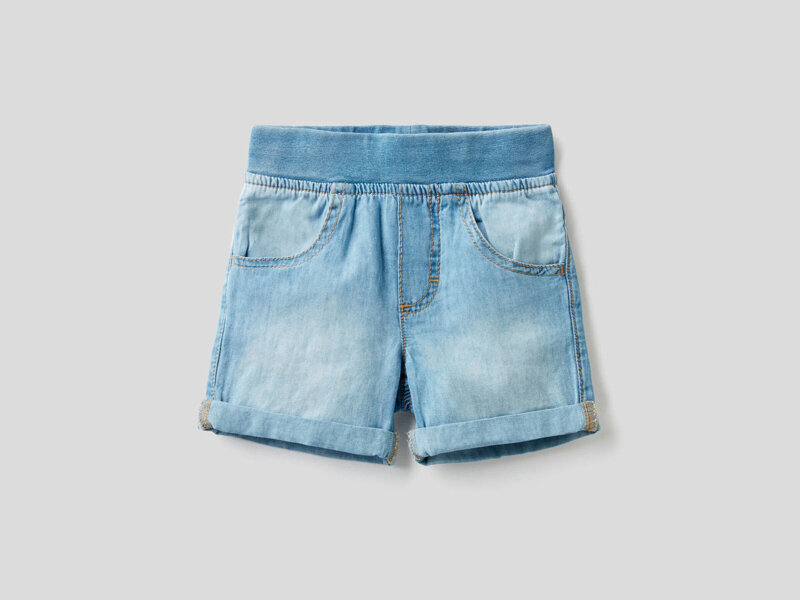 Pantaloncini corti in leggero tessuto di puro cotone effetto denim. Vita elasticizzata ton sur ton. Tasche stondate sul davanti e taschini applicati sul retro, di cui uno con logo ricamato. Aspetto vissuto e cuciture in contrasto colore. Leggeri, comodi e versatili come dei jeans.