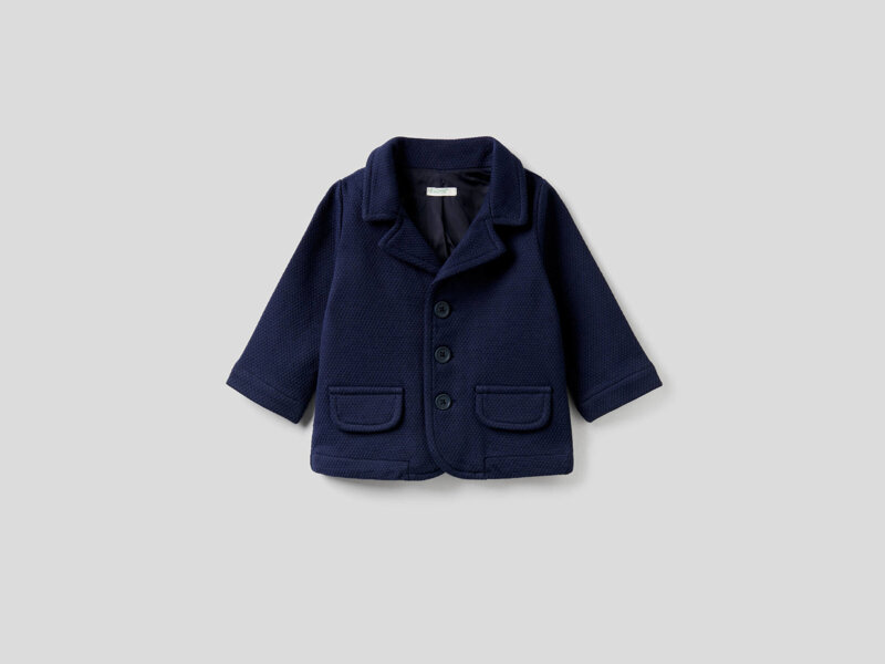 Giacca in felpa primaverile di misto cotone. Collo a revers, finte tasche davanti e spacco centrale sul retro. Mano consistente ma leggera con micro trama a rilievo. Solo in blu.