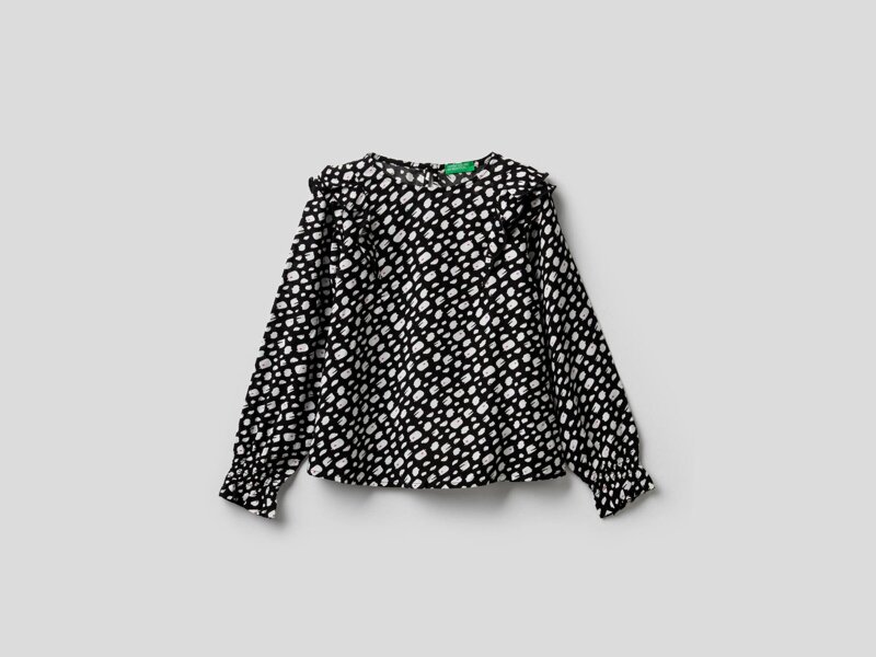Blusa girocollo in morbido tessuto stampato. Ricca di dettagli raffinati: volant sul davanti e giromanica, polsi arricciati con impunture elastiche e piccola rouche, apertura a goccia con bottone sul retro. Perfetta per le occasioni speciali.