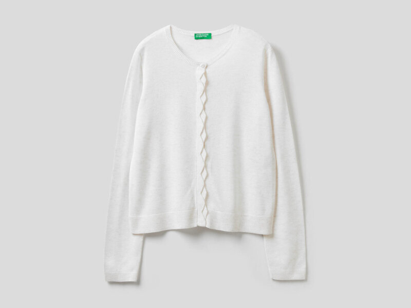 Morbido cardigan girocollo a manica lunga. Semplice ma raffinato con inserti in filo di lurex e abbottonatura frontale nascosta da una doppia lista lavorata. Solo in bianco.