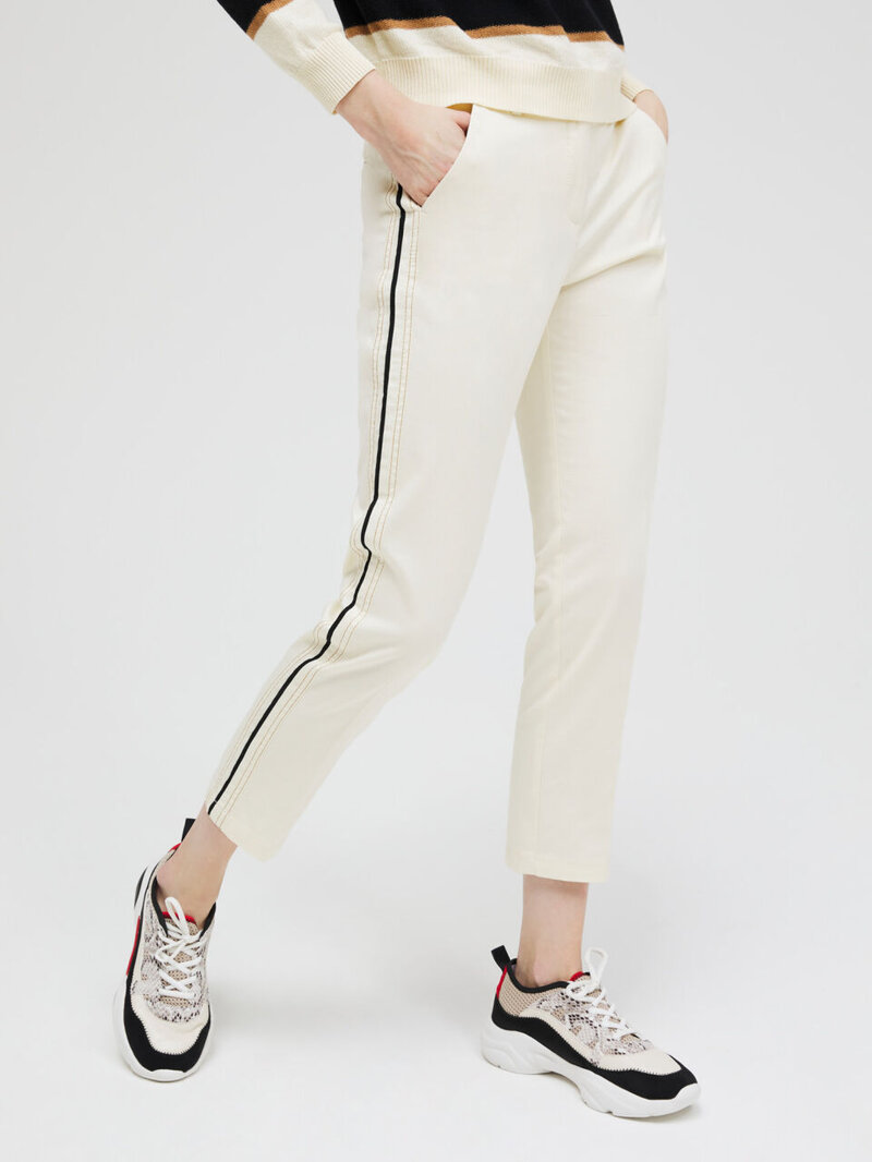 Pantaloni chino regular fit in cavallery di cotone elasticizzato, con dettaglio laterale di impunture con piping centrale. Disponibile in 2 colori.