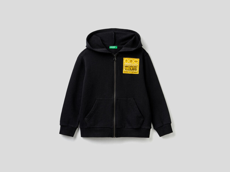 Felpa in puro cotone con cappuccio e apertura a zip. Un capo consistente ma leggero, ideale per le mezze stagioni. Comode tasche applicate davanti, cappuccio con applicazione ricamata multicolor e patch a contrasto lato cuore. Per essere originali anche nel tempo libero. Solo in nero.