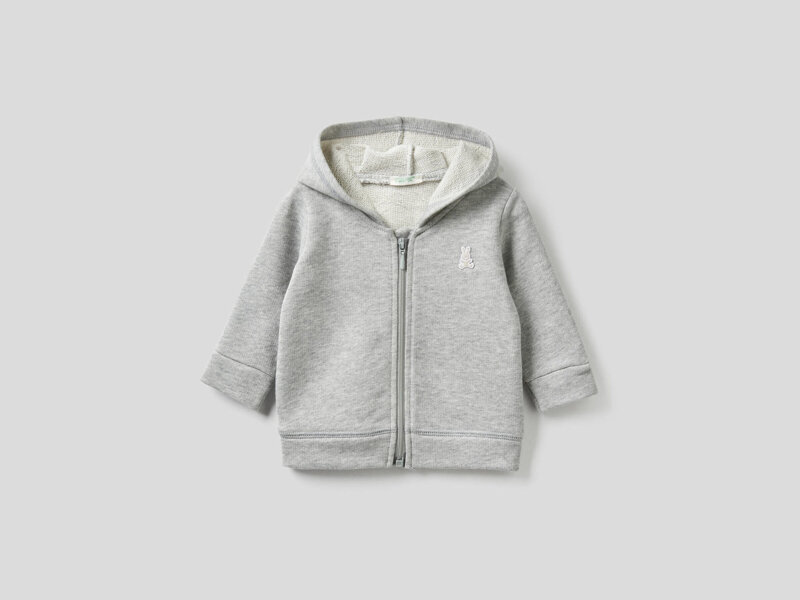Felpa primaverile in 100% cotone biologico con logo coniglietto ricamato lato cuore e apertura con zip. Un capo pratico e divertente grazie al suo cappuccio con orecchiette in jersey applicate. Solo in grigio.