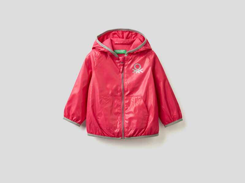 Giubbino leggero a manica lunga in tessuto lucido "Rain Defender" con cappuccio e pratica apertura a zip. Comode tasche a toppa davanti e logo glitterato lato cuore. Un capo indispensabile per le mezze stagioni. Solo in fucsia.