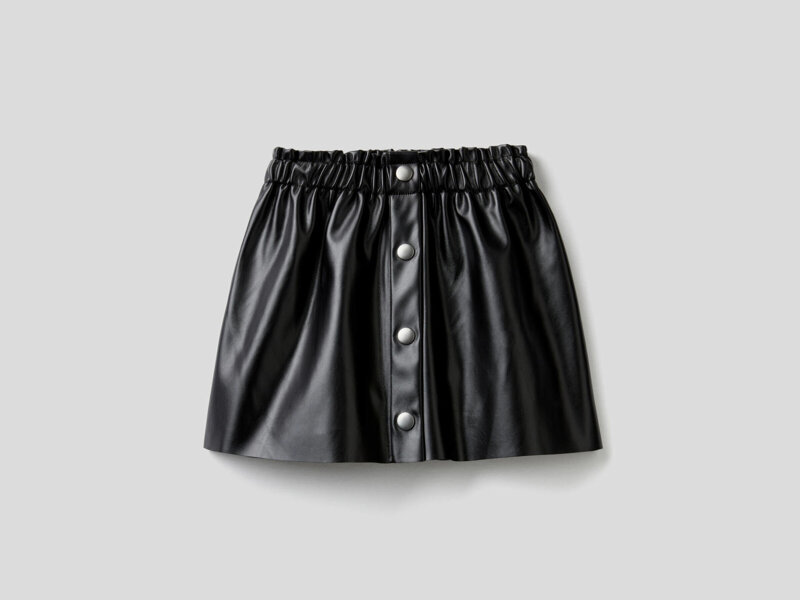 Gonna corta con taglio svasato in tessuto spalmato. Vita alta con elastico interno e rouche, bottoni decorativi in metallo sul davanti e fondo a taglio vivo per un look grintoso. Solo in nero.
