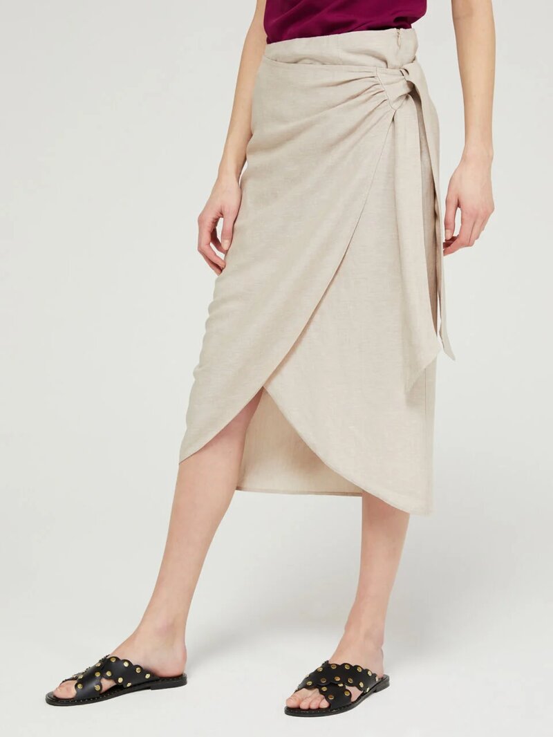 Gonna midi in misto lino e viscosa tinto filo, con fusciacca da annodare sul fianco. Disponibile in 2 colori.
