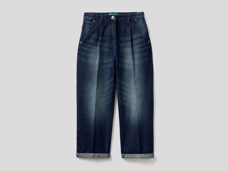 Pantaloni lunghi effetto vissuto in denim di puro cotone. Taglio mum fit a vita alta, con pieghe sul davanti. Tasche con rivetti squadrati davanti e tasche applicate sul retro. Vita con elastico interno regolabile. Possono essere indossati con o senza risvolto.