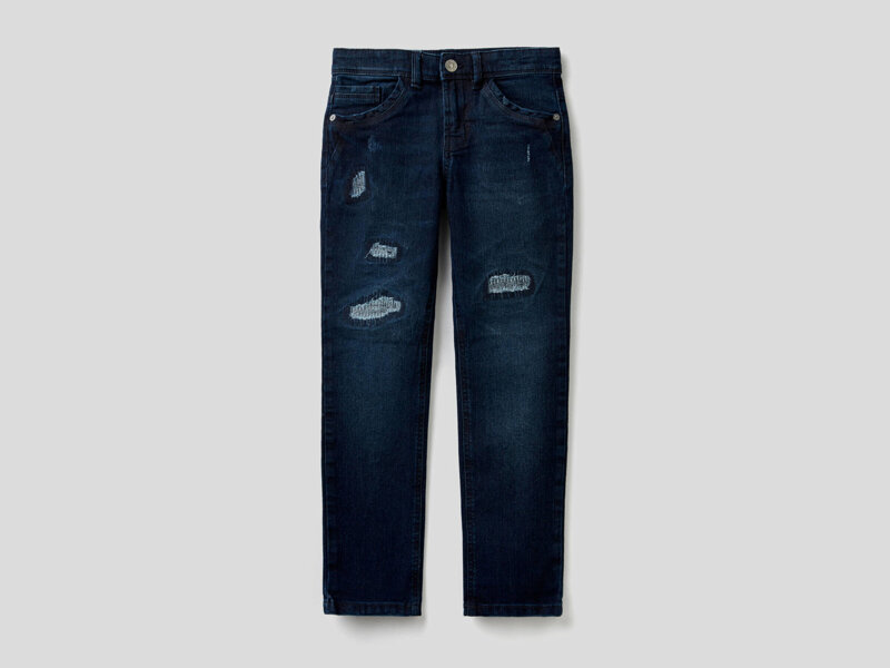 Jeans a cinque tasche con aspetto vissuto e rotture sulla lunghezza. Vestibilità slim e vita regolare con passanti. Realizzato in denim elasticizzato "Eco-Recycle", ottenuto da fibre rigenerate di cotone per ridurre l'impatto ambientale in tutte le fasi di produzione.