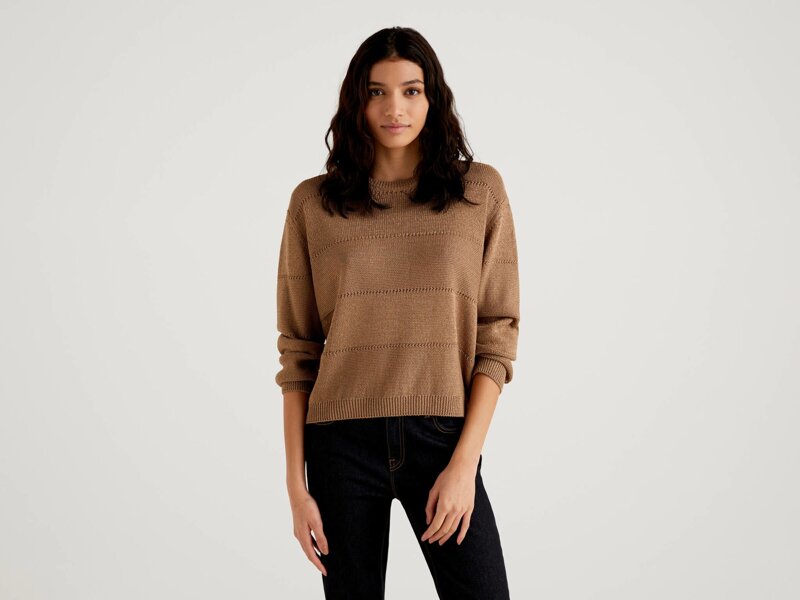 Maglioncino girocollo a manica lunga in misto viscosa dal peso leggero. Piacevole lavorazione a giochi di punti con effetto righe e inserti in filo di lurex. Un capo tinta unita che fa la differenza. Disponibile in 2 colori.