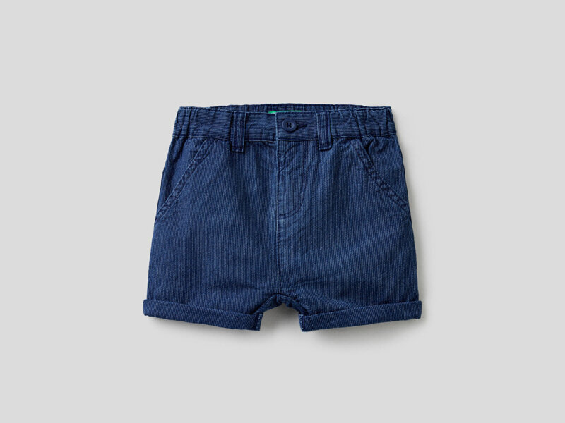 Shorts in denim di puro cotone con motivo a righe ton sur ton. Vita con elastico interno e bottone. Tasche davanti, retro con carré e taschini applicati. Risvolto sul fondo. Comodi, versatili e facili da abbinare.