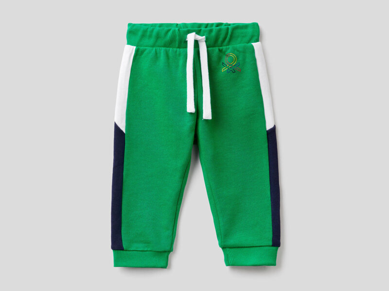 Pantaloni lunghi in felpa primaverile di puro cotone biologico. Arricchiti da inserti color block laterali lungo la gamba. Stampa logo sul davanti e tasca applicata sul retro. Facili da indossare, con coulisse ed elastico interno in vita.