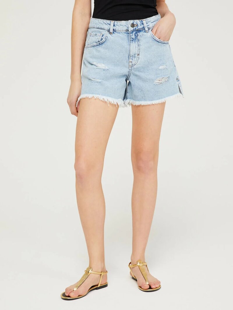 Shorts a vita alta in denim 100% cotone effetto vintage, con rotture e fondo sfrangiato.