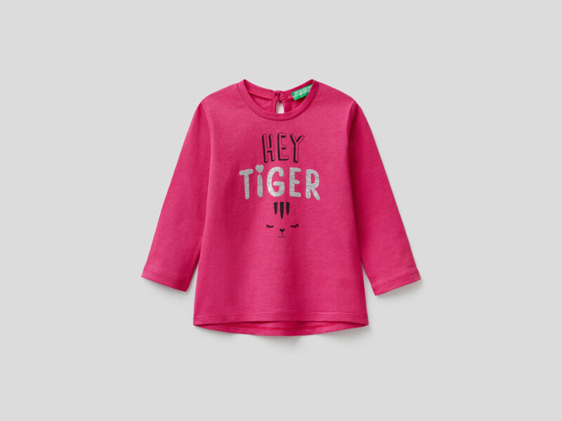 T-shirt girocollo a manica lunga in puro cotone biologico. Basica e quotidiana, è arricchita da una stampa glitterata sul davanti. Fondo stondato, leggermente più lungo dietro. Disponibile in 4 colori.