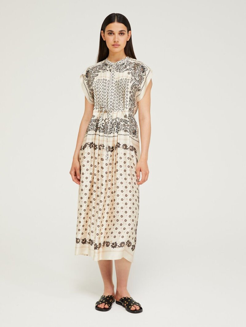 Vestito caftano smanicato in raso di viscosa fluida stampata, con motivo di pieghe davanti e dietro, cinturina in vita e spacchi laterali sul fondo.