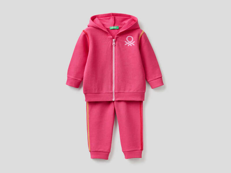 Comoda tuta in puro cotone biologico composta da felpa a maniche lunghe con cappuccio, apertura a zip e logo stampato lato cuore. Abbinata a pantaloni lunghi con coulisse in vita e tasca a applicata sul retro. Leggera ma consistente è un capo basico arricchito da divertenti profili colorati in contrasto. Disponibile in 2 colori.